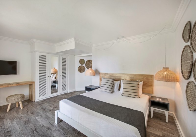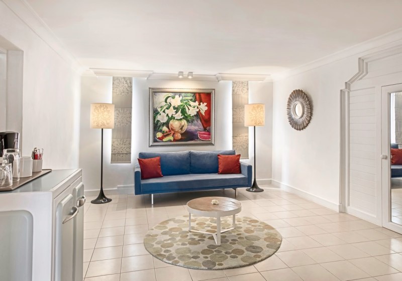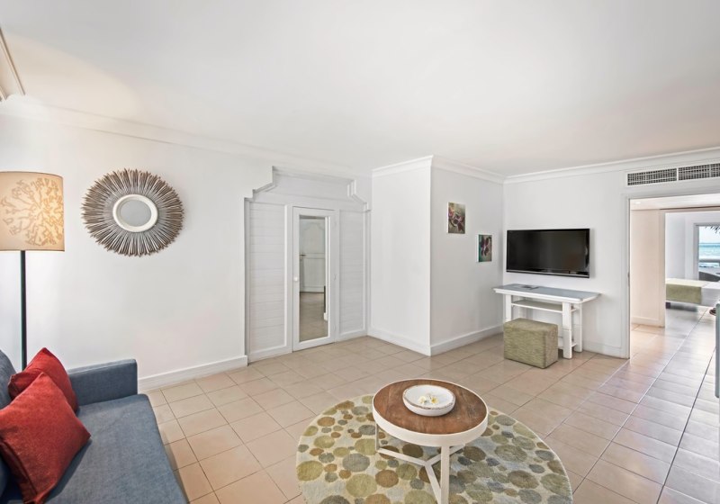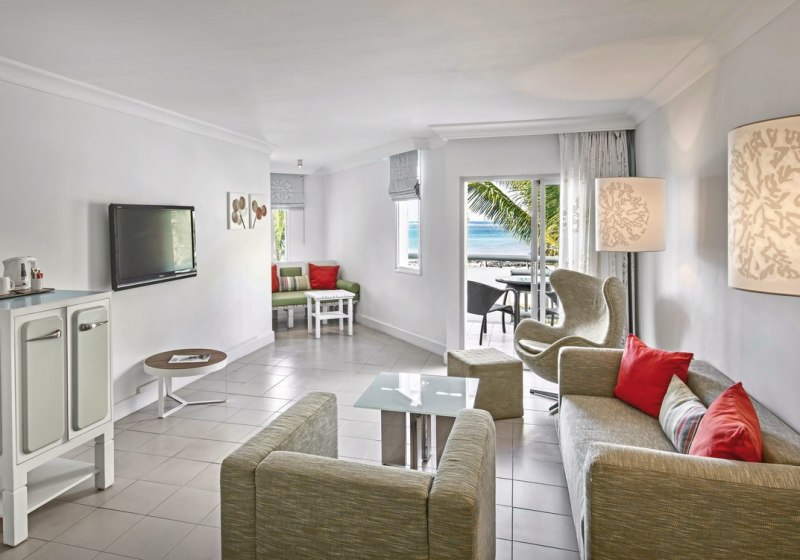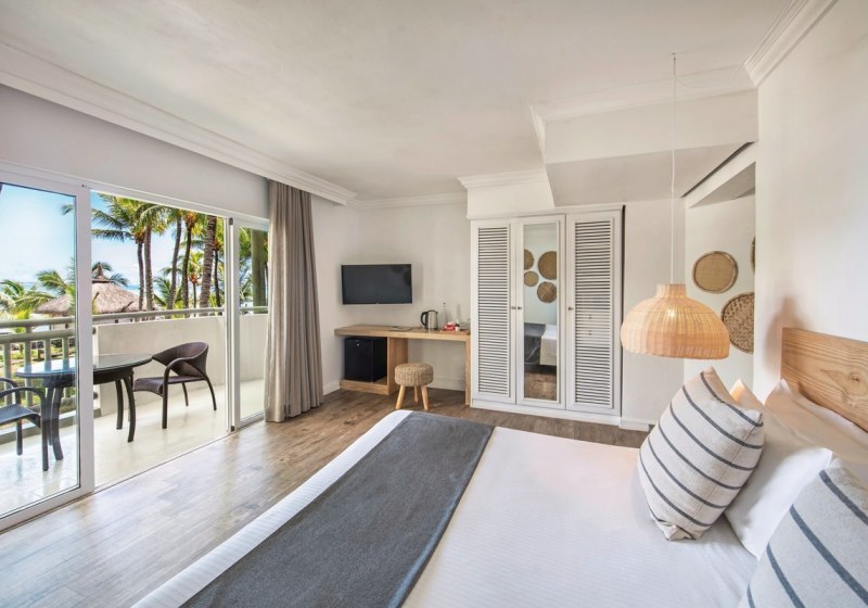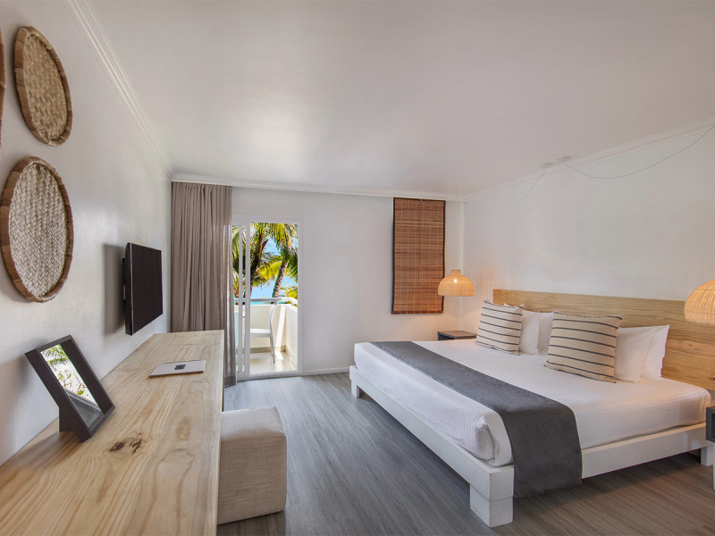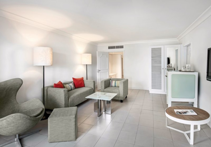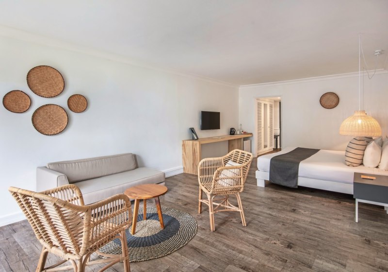 Die Zimmer messen etwa 30 bis 42 m² und bieten je nach Kategorie Balkon oder Terrasse, zur Garten- oder Meerseite. Klimaanlage, Dusche/WC, LCD-TV, WLAN, Safe, Minibar sowie Kaffee- und Teezubereiter gehören zur Grundausstattung. Ihr schlaft in Kingsize- oder Twin-Betten.