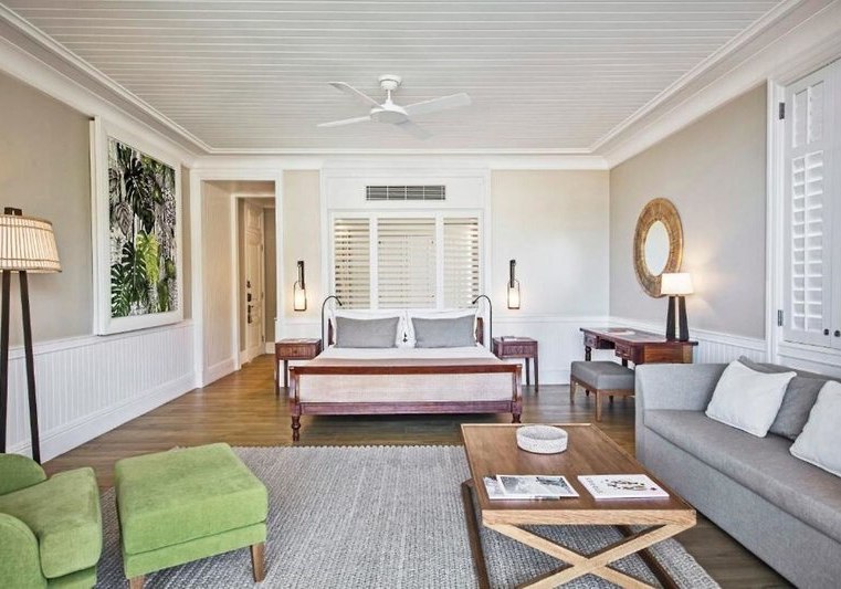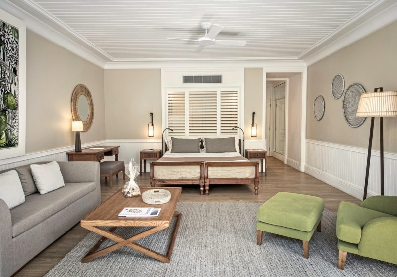 Die Deluxe Suiten (ca. 62 m²) und Junior Suiten (ca. 81 m²) bieten viel Platz, Bad mit Wanne und Dusche/WC, in der Junior Suite mit freistehender Wanne. Klimaanlage und Deckenventilator sorgen für das richtige Klima, Sat‑TV, Telefon und Wi‑Fi halten Euch verbunden. Highlight: Grosszügige Suiten mit klarer Trennung von Wohn- und Ruheflächen.