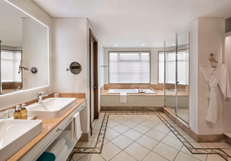 Eure Zimmer messen etwa 50 Quadratmeter und kombinieren Schlaf- und Wohngefühl in einem aufgeräumten Layout. Bad mit Badewanne und Dusche, separates WC sowie Föhn, Klimaanlage, Safe, TV, Telefon und WLAN bilden die solide Grundausstattung. Ein Kaffee- und Teezubereiter gehört ebenso dazu; die Minibar ist gegen Gebühr nutzbar.