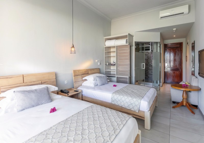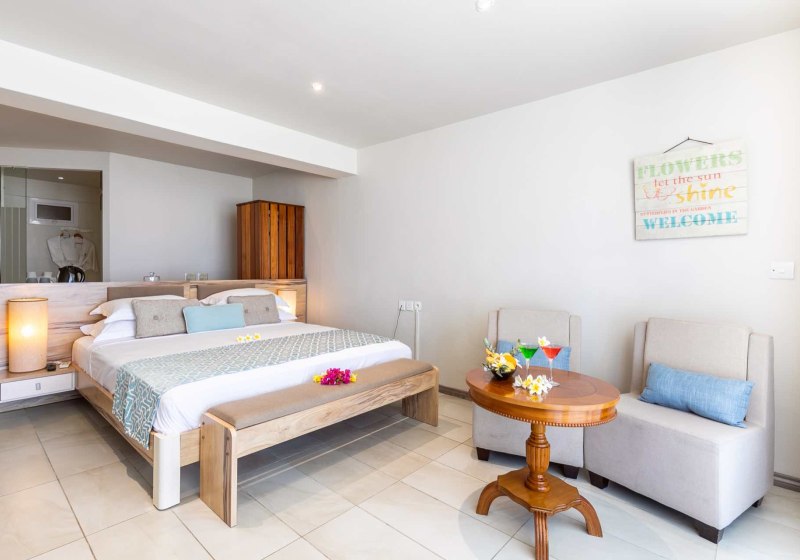 Die Zimmer sind funktional ausgestattet: Dusche und WC, Föhn, Kaffee- und Teezubereiter, Sat-TV, Telefon, Safe, Klimaanlage sowie Balkon oder Terrasse. Internetzugang und WiFi stehen zur Verfügung. Je nach Wunsch blickt Ihr in den Garten oder auf das Meer. Highlight: Klare Ausstattung mit Klimaanlage und eigenem Außenbereich.