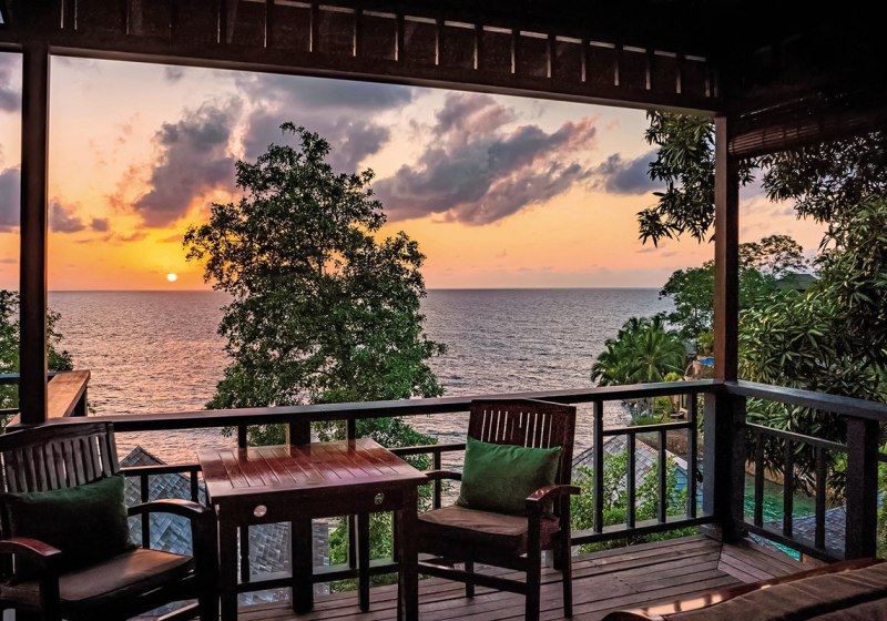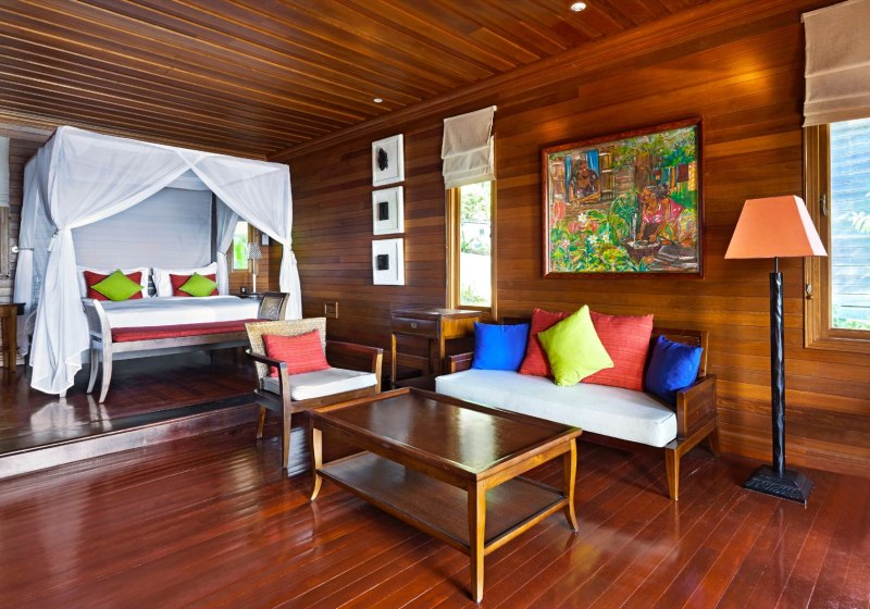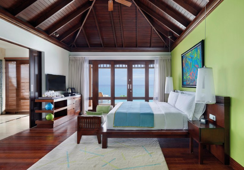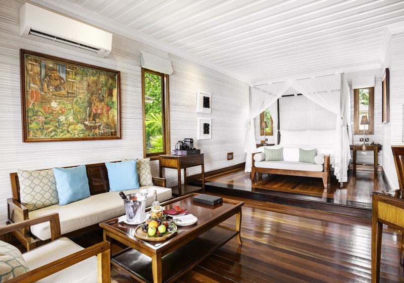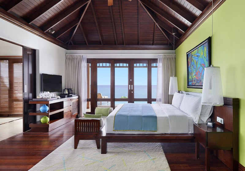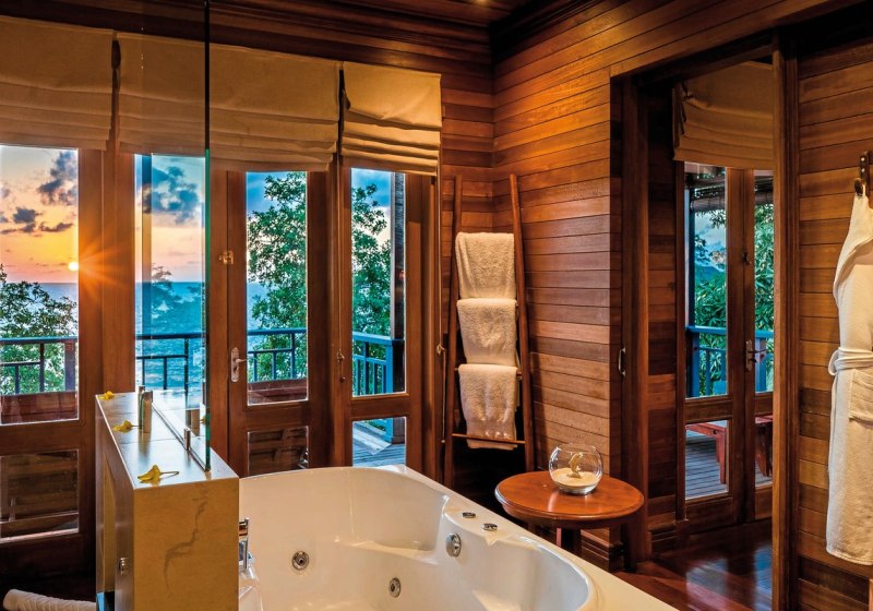 Die Villen prägen das Wohngefühl – mit Raum, Privatsphäre und Meerblick. Ein Beispiel ist die Sunset Villa mit etwa 90 Quadratmetern. Drinnen verbinden sich Whirlpool-Badewanne, begehbare Dusche und separates WC mit funktionaler Ausstattung: Klimaanlage, Flachbild-Sat-TV, Safe, Minibar, Telefon, Kaffee- und Teezubereiter, Föhn und Bademäntel.