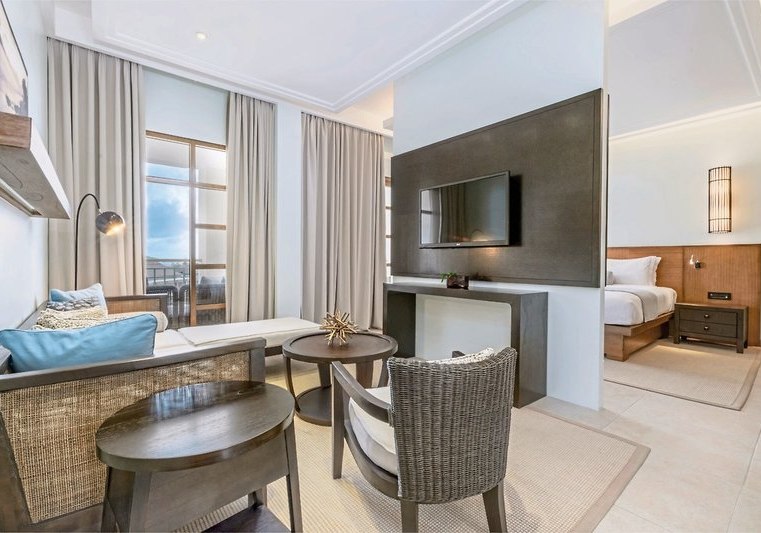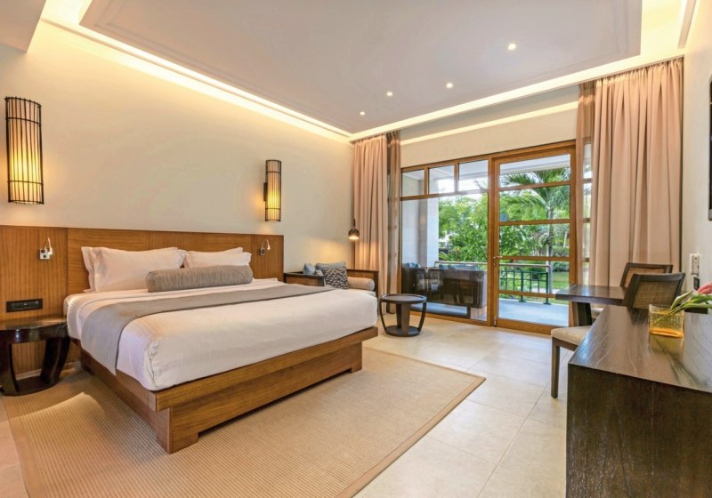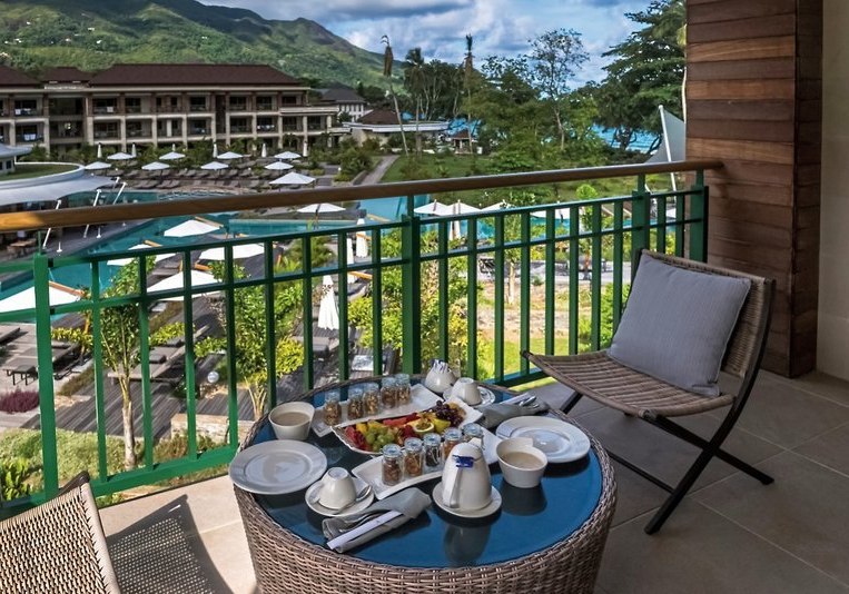Die Doppelzimmer bieten rund 51 m² Fläche mit Balkon oder Terrasse. Ihr blickt über die Gärten oder hinauf zum Morne Seychellois. Innen erwartet Euch eine klare Ausstattung mit Klimaanlage, Flatscreen-TV und WLAN, ergänzt durch einen Sitzbereich mit Schlafsofa.