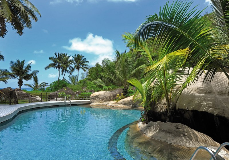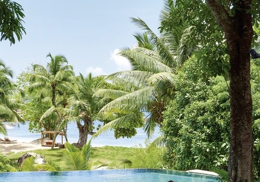 Die Lage an der Nordwestküste von Praslin ist präzise definiert: direkt an Anse Georgette, Grande Anse Kerlan und Petite Anse Kerlan. Ihr tretet aus der Anlage unmittelbar an den Strand und habt damit Meer und Sand als tägliche Kulisse. Die Umgebung wirkt naturbetont und weitläufig, mit kurzen, logischen Wegen zwischen Strandzugängen, Poolbereich und den öffentlichen Zonen der Anlage.