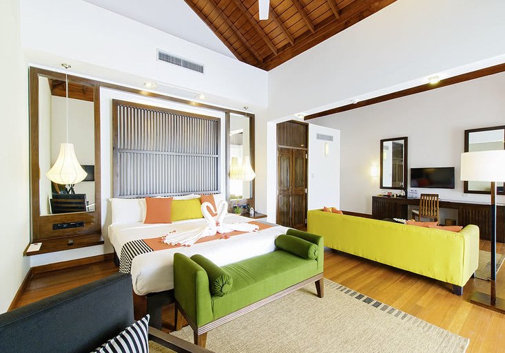 Ihr wohnt in Zimmern ab ca. 37 m² mit Dusche/WC, Föhn, Klimaanlage, Sat-TV, Minibar, Safe, Telefon sowie Kaffee- und Teezubereiter. Balkon oder Terrasse gehören dazu; ein DVD-Player ist auf Anfrage verfügbar. Im Garten stehen freistehende Bungalows, während zweistöckige Hauptgebäude kurze Wege zu Pools und Strand bieten. Highlight: Villen mit ca. 44 m² und möblierter Terrasse für mehr privaten Außenraum.