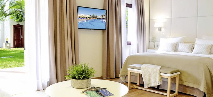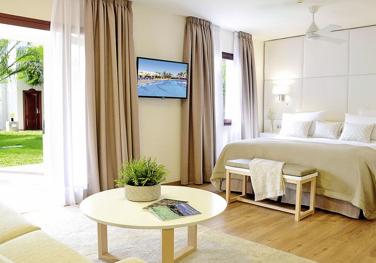 Die Juniorsuiten bieten auf etwa 42 m² einen Schlafbereich, teils optisch abgetrennt, sowie einen Wohnraum mit Schlafcouch. Suiten mit circa 45 m² verfügen über ein separates Schlafzimmer; mit zwei Schlafzimmern sind es rund 53 m². Balkon oder Terrasse öffnet den Blick in Garten- oder Poolbereiche, überwiegend liegt Laminatboden.