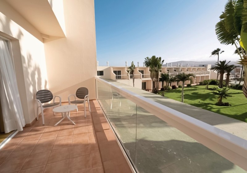 Die Doppelzimmer bieten mit rund 39 Quadratmetern spürbar Platz. Klimaanlage, Sat-TV, Safe sowie Tee- und Kaffeezubereiter gehören zur Ausstattung. Das Bad verfügt je nach Einheit über Dusche oder Badewanne sowie WC und Föhn. Balkon oder Terrasse erweitern den Raum ins Freie, teils mit Blick auf den Pool.