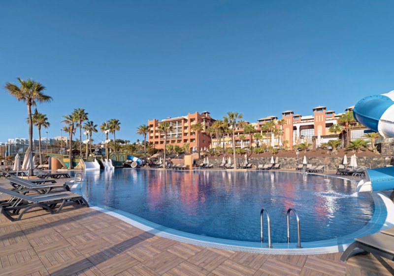 Die 354 Zimmer verteilen sich auf eine Anlage mit Garten, Sonnenterrassen und drei Außenpools, einer davon im Winter beheizt. Für Kinder gibt es zwei beheizbare Becken, Splash-Park und ein Piratenschiff mit Rutschen. WLAN ist im gesamten Hotel verfügbar, die Empfangshalle mit Rezeption wirkt als zentrale Anlaufstelle.