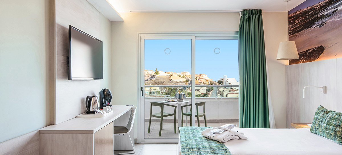 Die 2017 renovierten Zimmer sind Nichtraucher und funktional ausgestattet. Sat‑TV, gratis Safe, zentral geregelte Klimaanlage sowie Dusche/WC und Föhn gehören dazu. Viele Einheiten bieten Balkon oder Terrasse; je nach Zimmer blickt Ihr seitlich aufs Meer, auf Pool, Straße oder Richtung Strand. Highlight: Minibar ist leer, Auffüllung erfolgt auf Wunsch gegen Gebühr.