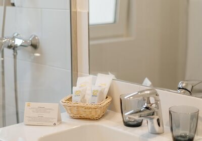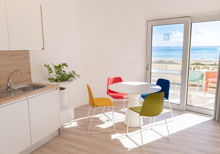 Studios sind kompakt angelegt (ca. 10–12 m²) mit kombiniertem Wohn-/Schlafraum, Kitchenette und Balkon mit seitlichem Meerblick; sie sind für maximal eine erwachsene Person ausgewiesen. Appartements sind je nach Kategorie mit Meerblick buchbar. Babybett, Doppelbett oder zwei Einzelbetten sind in den Angaben geführt. Das Haus umfasst 41 Appartements und 1 Studio, verteilt über fünf Etagen; Baujahr 1992, Renovierung 2019.