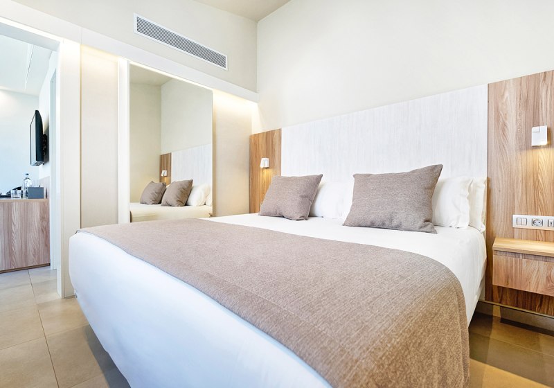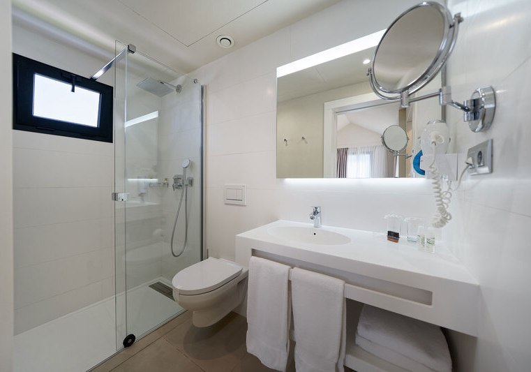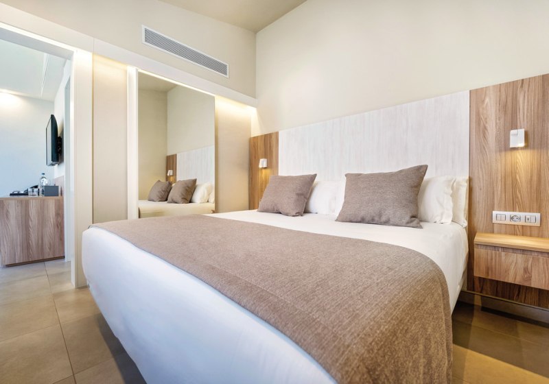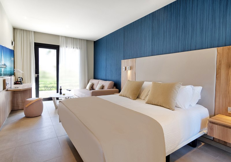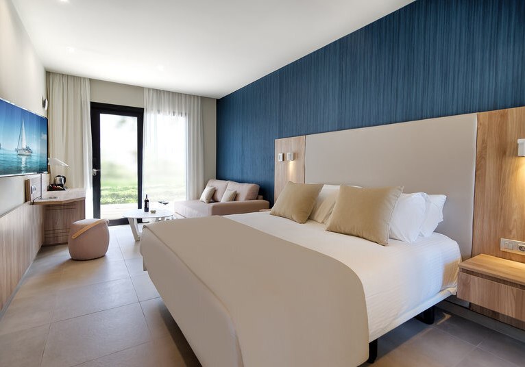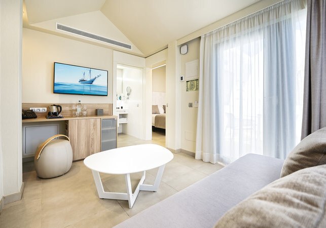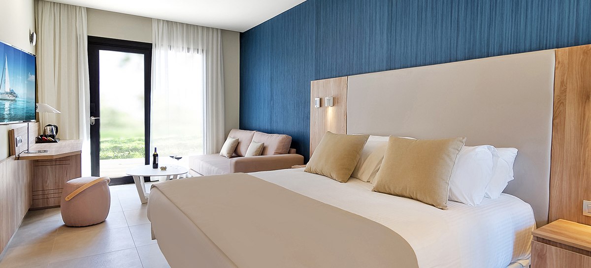 Die Zimmer setzen auf private Außenflächen: möblierte Terrassen mit kleinem Garten und zwei Sonnenliegen schaffen Rückzug – einige mit eigenem Garten samt Whirlpool. Drinnen sorgen zentrale Klimaanlage, Safe, Sat-TV, Tee- und Kaffeezubereiter sowie eine Dusche mit Föhn für Komfort; teilweise öffnet eine Glasfront das Bad zum Raum. Mit Shuttle zum Strand, Fitnessraum und verlässlichem Service richtet sich das Haus an Erwachsene, die klare Strukturen schätzen.