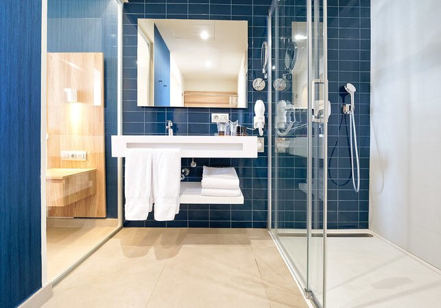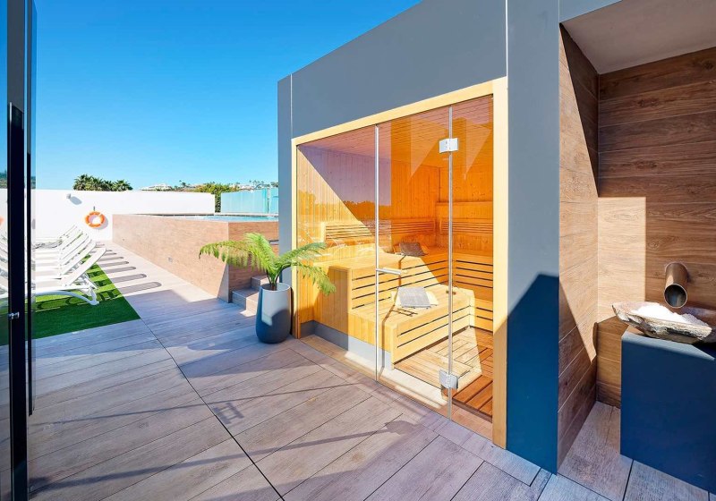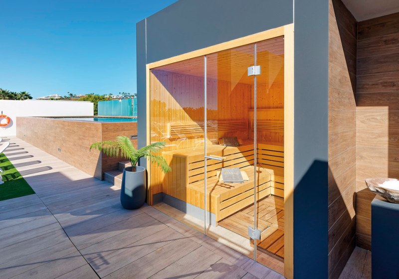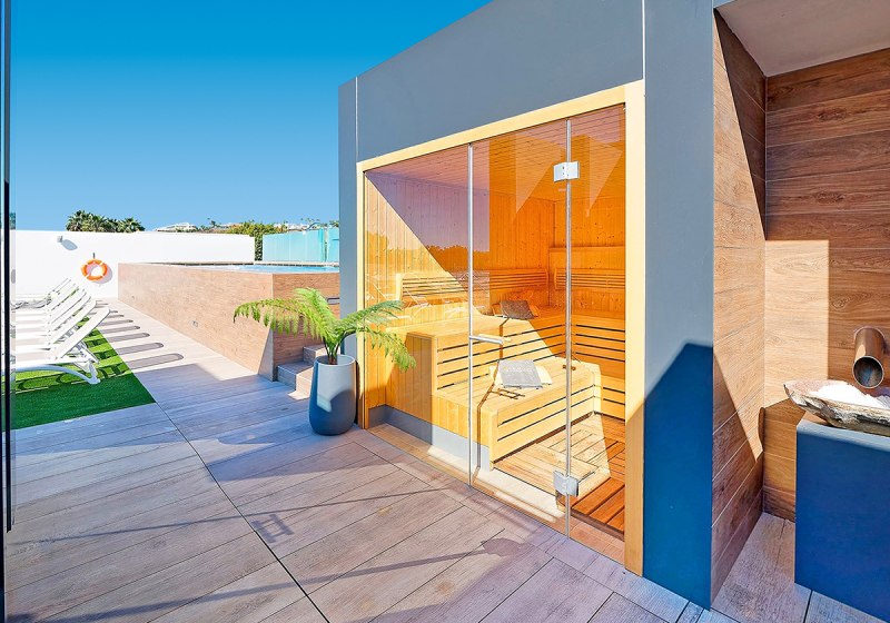- Spa: Sauna, Dampfbad und Hydrotherapie-Elemente in kompaktem Setup.