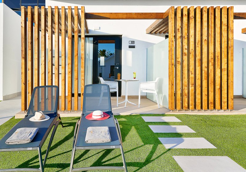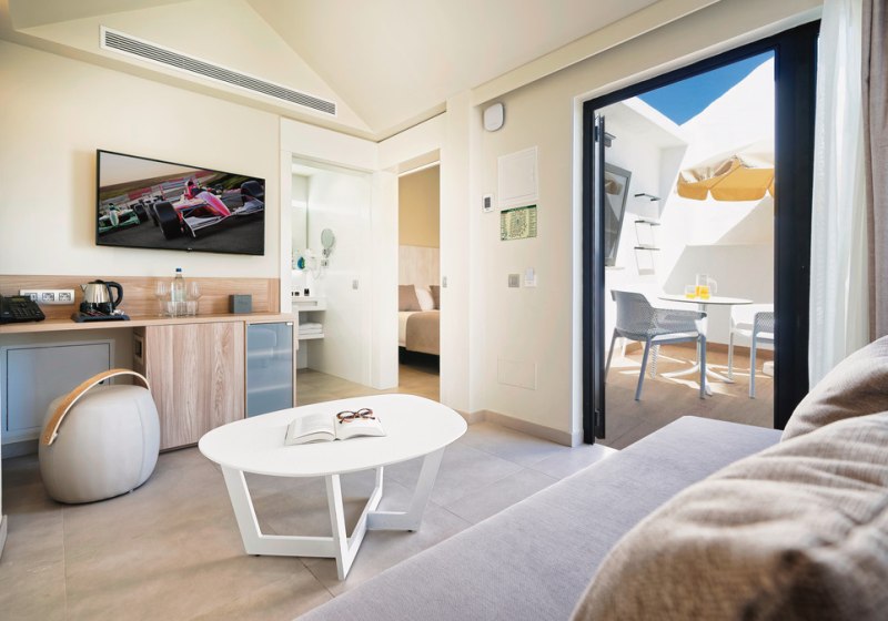 Eure Zimmer setzen auf klare Linien und private Außenflächen. Jede Wohneinheit bietet eine möblierte Terrasse mit kleinem Garten und zwei Sonnenliegen. Innen findet Ihr einen kombinierten Wohn-/Schlafraum, zentrale Klimaanlage, Sat-TV, Safe, Minibar (leer), Tee-/Kaffeezubereiter sowie Dusche/WC und Föhn. Teilweise öffnet eine Glasfront das Bad zum Raum.