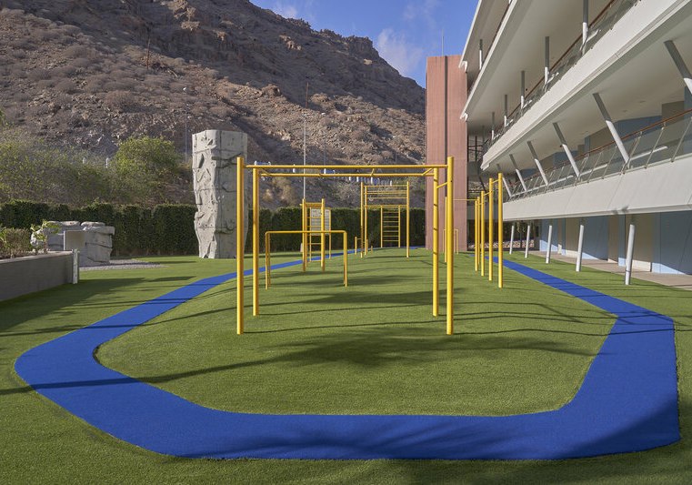 Auf dem Gelände findet Ihr vielfältige Trainingsmöglichkeiten: einen 24-Stunden-Fitnessraum ab 16 Jahren, funktionales Outdoor-Training, eine Kletterwand und eine Rennpiste. Das Yoga-Deck schafft Raum für ruhige Einheiten. Für Ballspiele stehen Multifunktionsplatz, Volleyball-Sandplatz, Tennis- und Padelplatz bereit, teils mit Reservierung.