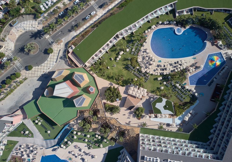 Die Anlage ist groß angelegt und übersichtlich strukturiert. 422 Zimmer und Suiten, eine klare Lobby mit Sitzbereichen und Aufzügen sowie kostenfreies WLAN im gesamten Hotel bilden die Basis. Draußen warten zwei ganzjährig beheizte Pools, ein Splash Park, Liegen, Sonnenschirme und ein Außen-Whirlpool.