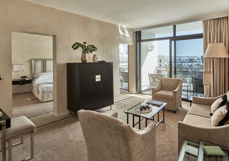 Die Juniorsuiten mit etwa 48 Quadratmetern verfügen über einen offenen Wohn-/Schlafbereich, Dusche und teilweise zusätzliche Badewanne, dazu eine Espressomaschine und wahlweise Garten-, Pool- oder Meerblick. Die Anlage ist barrierefrei gestaltet; es stehen entsprechend ausgestattete Zimmer bereit, damit Ihr Wege und Abläufe komfortabel plant.