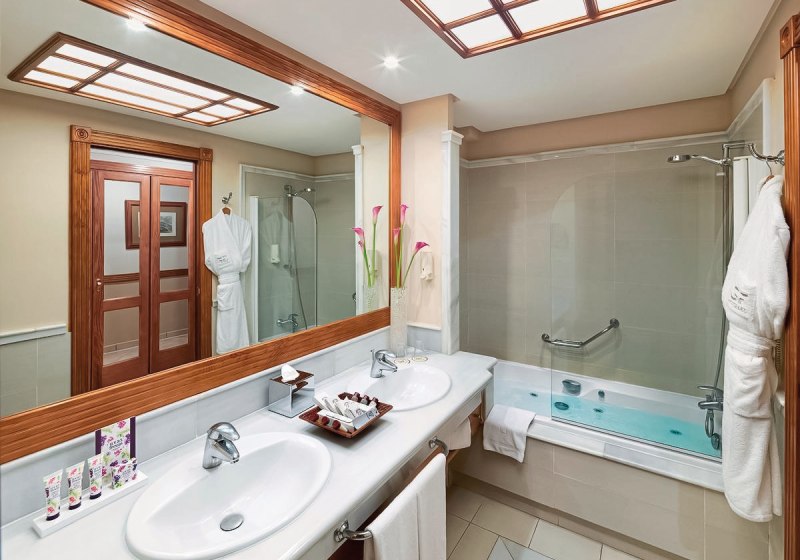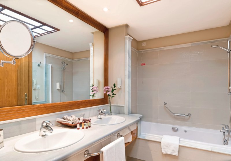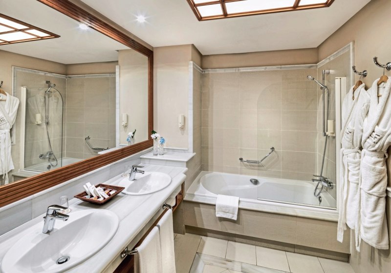 Eure Zimmer sind funktional ausgestattet: WLAN inklusive, Sat-TV, Telefon und Safe sorgen für Komfort. Klimatisierung, Kaffee-/Teezubereiter, Minibar auf Anfrage und eine Sitzgruppe runden ab. Das Bad mit zwei Waschbecken und Wanne, separatem WC, Bademantel und Föhn wirkt großzügig gedacht; viele Einheiten verfügen über Balkon.