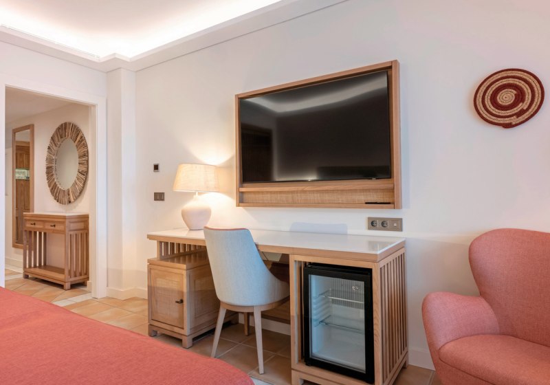 Für Familien steht eine Schlafcouch als Zustellbett bereit. Suiten bieten einen separaten Wohn- und Schlafbereich sowie Badezimmer mit Hydromassage, teils mit Terrasse oder Balkon. Ausgewählte Kategorien verfügen über seitlichen Meerblick. Kopfkissenauswahl und Schreibtisch unterstreichen den Fokus auf individuell passendes Wohnen. Highlight: Suiten kombinieren Raumtrennung und Hydromassage-Bäder.