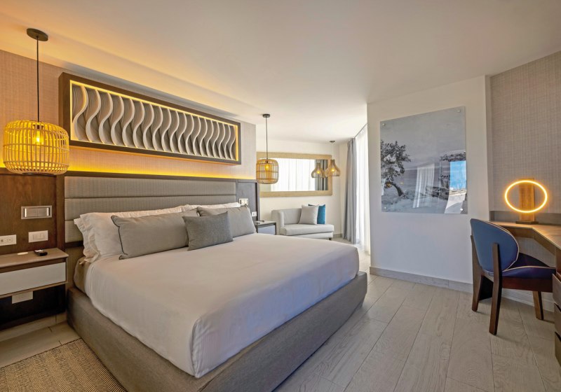 Ihr wohnt in hellen Zimmern mit möbliertem Balkon oder Terrasse, Dusche und separatem WC. Klimaanlage ist individuell regulierbar, teils ergänzt durch Ventilator. Minibar wird regelmäßig aufgefüllt, Safe, Bügeleisen mit Brett, TV, WLAN und Kaffee-/Teezubereiter gehören zur Standardausstattung. Der Fliesenboden sorgt für klare Anmutung und gute Pflegeeigenschaften. Highlight: Viele Zimmeroptionen mit Meerblick, Whirlpool oder direktem Poolzugang.