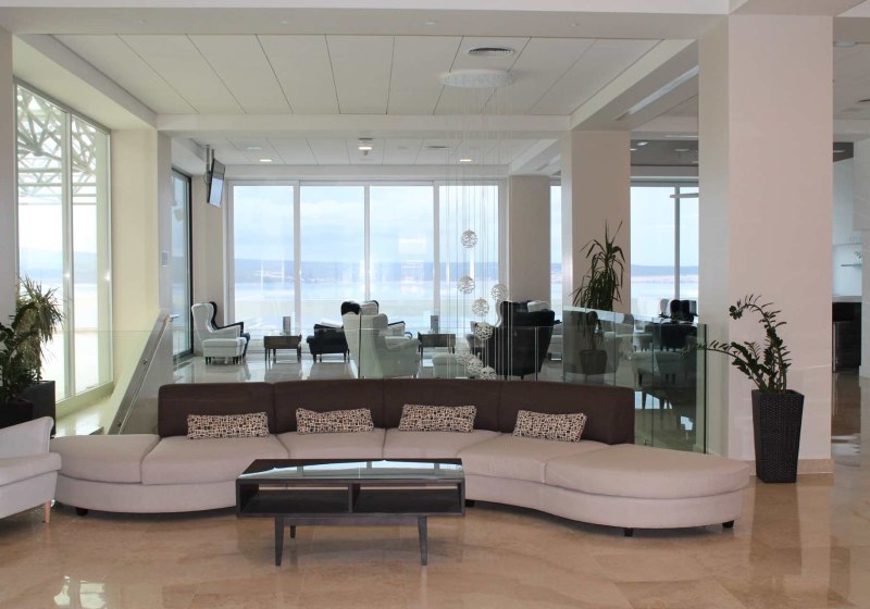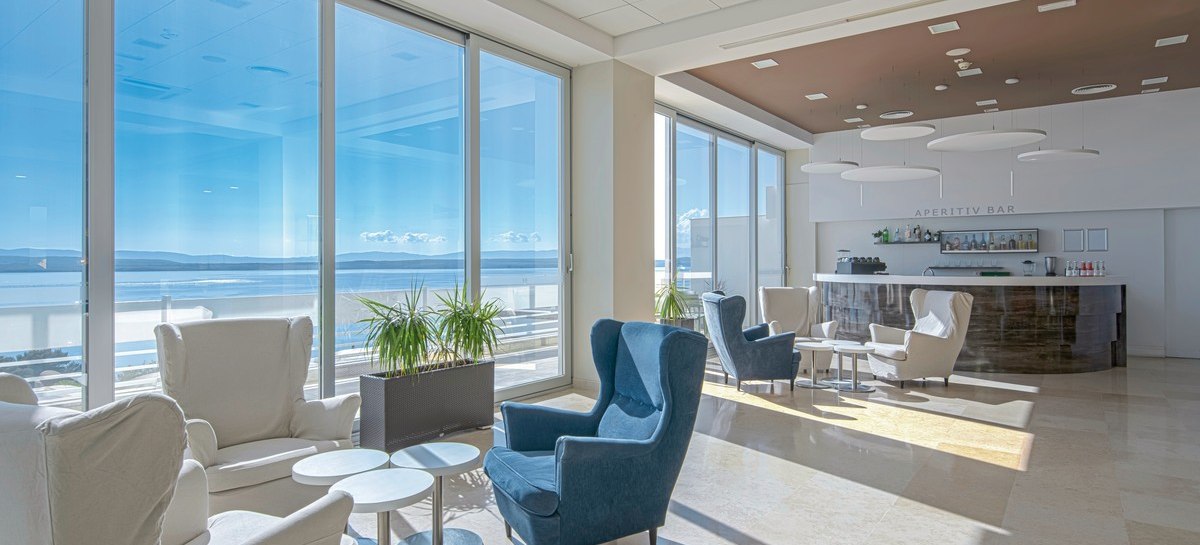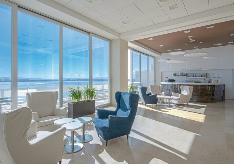 Im Hotel Omorika wohnt Ihr in einem Haus mit 115 Zimmern, verteilt auf sechs Etagen mit zwei Aufzügen. Das Ambiente wirkt klar strukturiert: Rezeption und Lobby gehen in Terrassenbereiche über, die Euch Richtung Meer orientieren. Nur 150 Meter trennen Euch vom Kiesstrand, sodass Ihr den Tag flexibel zwischen Hotel und Strand plant.