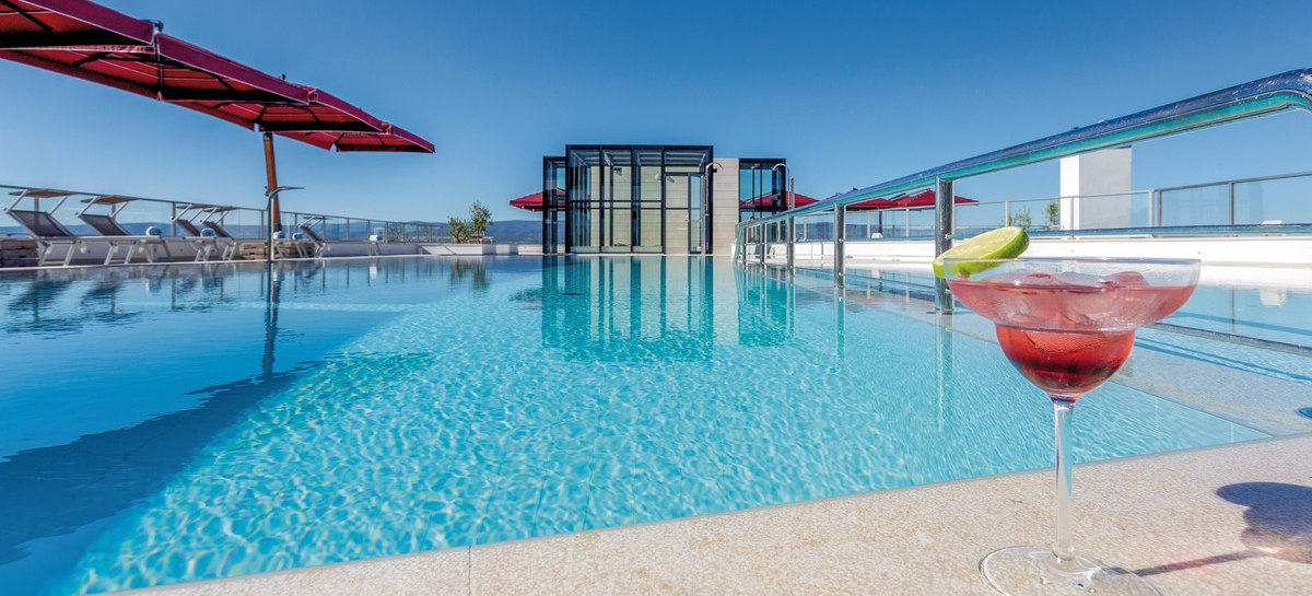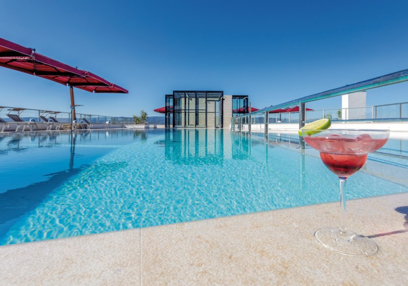Weitere Services runden das Bild ab: Rezeption und Concierge, Mietwagen- und Fahrradverleih, Wäscherei- und Trockenreinigungsservice, Bankettsaal und Konferenzraum, Aufzug und Geldautomat. Eine Dachterrasse, Gartenbereiche und verschiedene Bars schaffen Zonen mit unterschiedlichem Charakter. So bleibt der öffentliche Bereich übersichtlich und funktional. Highlight: Außen- und Hallenpool plus Sonnenterrasse bündeln Komfort auf kurzen Wegen.