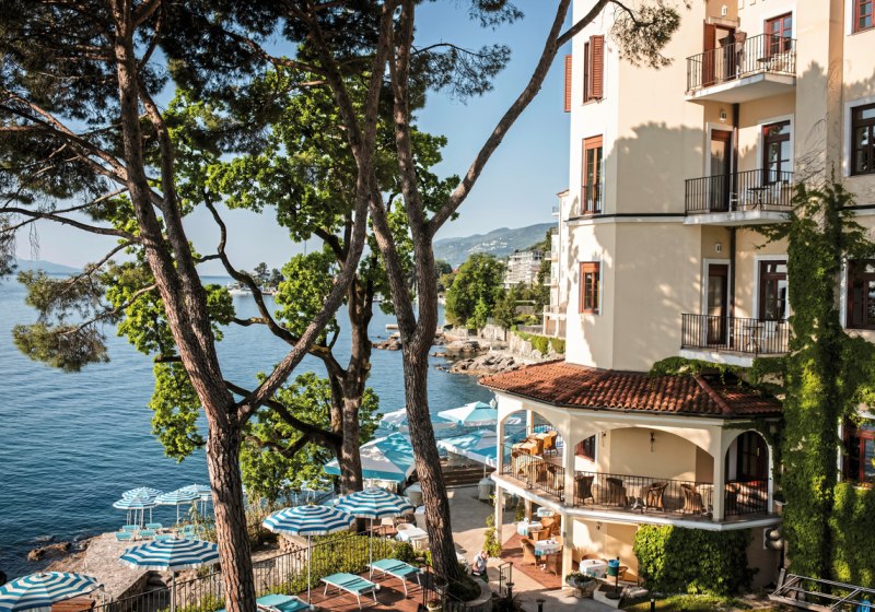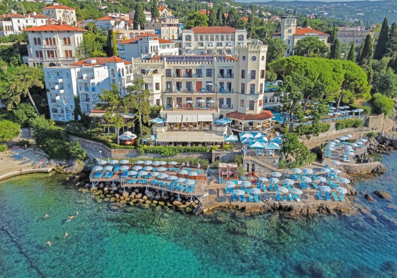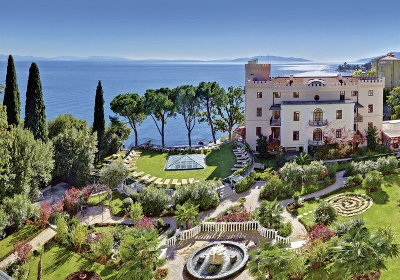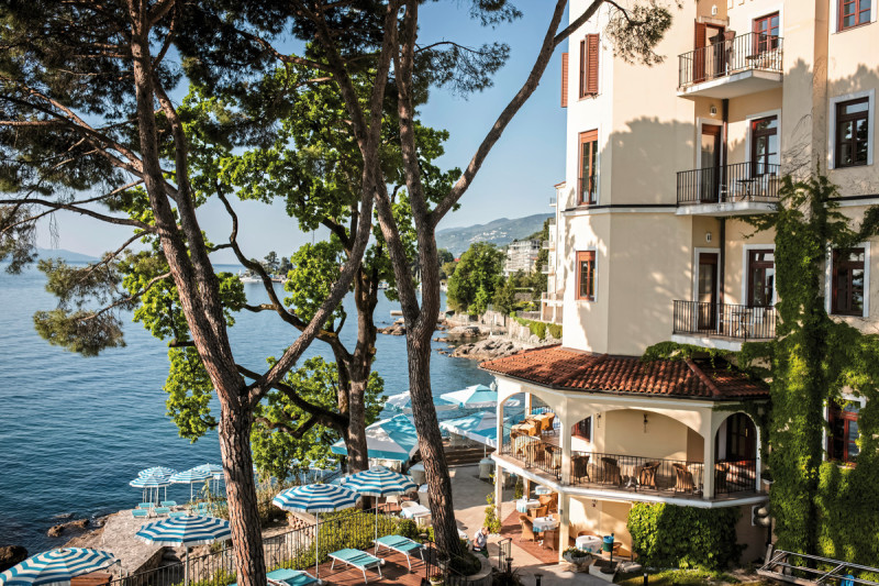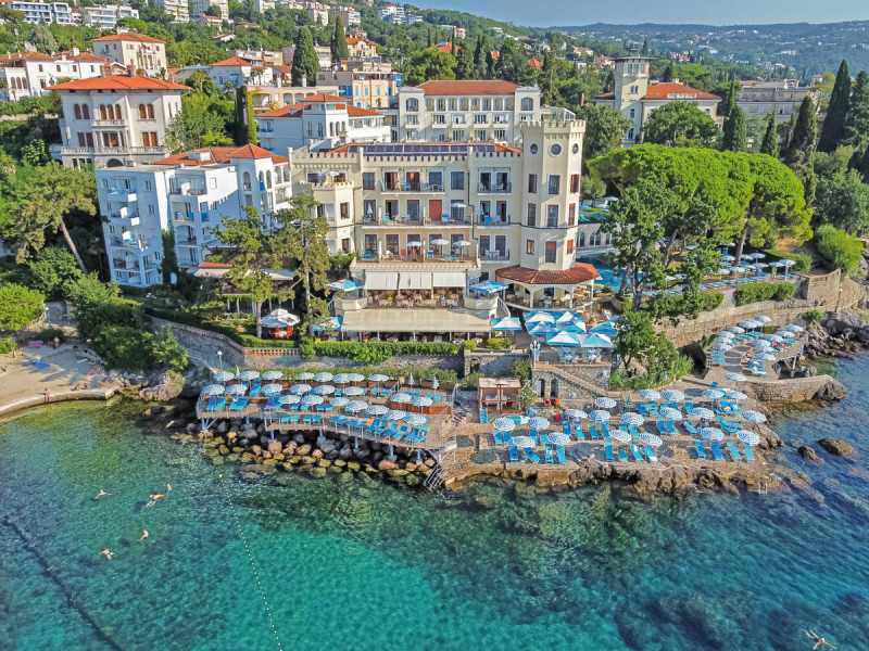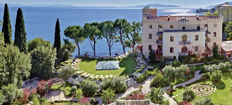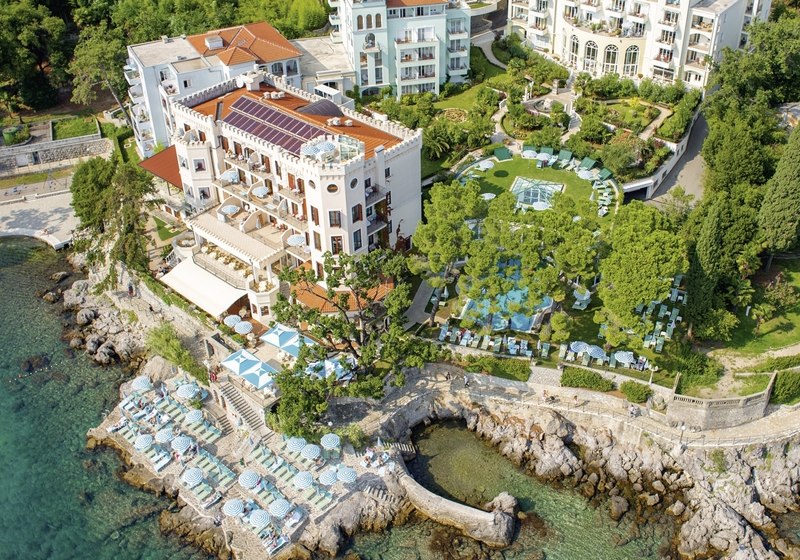 Im Miramar wohnt Ihr in einem Ensemble aus fünf Gebäuden direkt am Meer – mit der Belle-Époque-Villa Neptun von 1876 als stimmungsvollem Herzstück. Die Architektur rahmt den Blick über die Kvarner Bucht, während Ihr zwischen Felsstrand, Gartenbereichen und großzügigen Ruheplätzen euren Tag strukturiert. Die Atmosphäre wirkt gepflegt, entspannt und klar auf Genuss ausgerichtet.