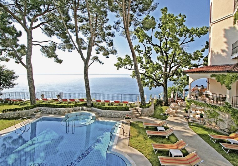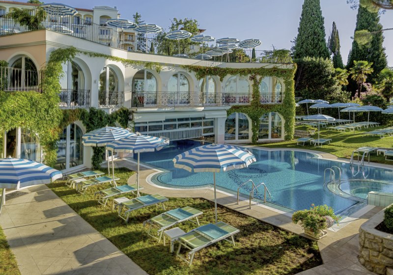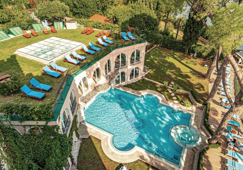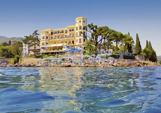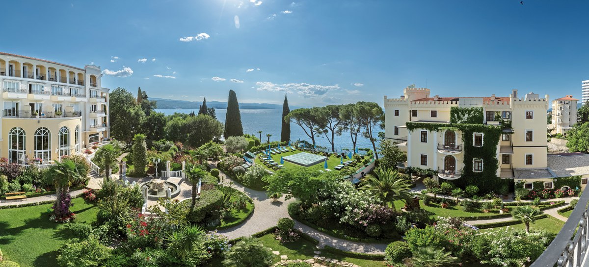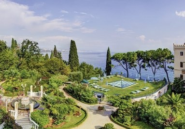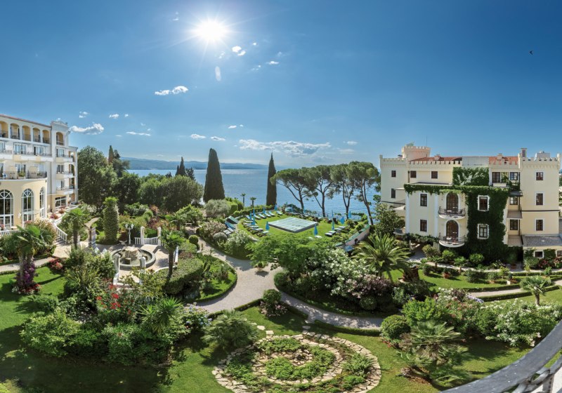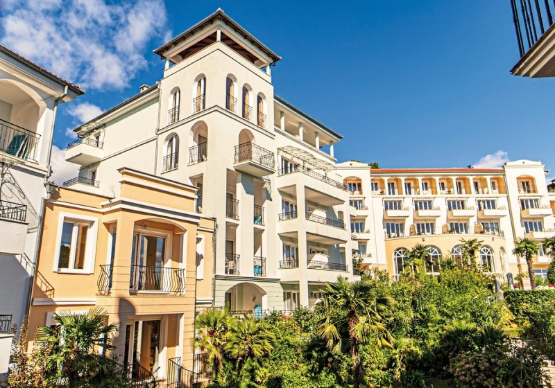 Im Miramar wohnt Ihr in einem Ensemble aus fünf Gebäuden direkt am Meer – mit der Belle-Époque-Villa Neptun von 1876 als stimmungsvollem Herzstück. Die Architektur rahmt den Blick über die Kvarner Bucht, während Ihr zwischen Felsstrand, Gartenbereichen und großzügigen Ruheplätzen euren Tag strukturiert. Die Atmosphäre wirkt gepflegt, entspannt und klar auf Genuss ausgerichtet.