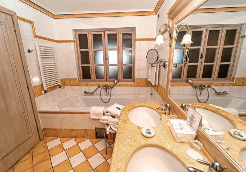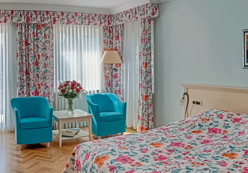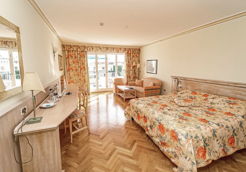 Die Zimmer sind je nach Kategorie etwa 31 bis 40 Quadratmeter groß und verfügen über Balkon, Parkettboden sowie Bad mit Dusche oder Badewanne. Bademantel und Haartrockner liegen bereit. Sat-TV, Safe und Klimaanlage sorgen für Komfort, WLAN ist inkludiert. Die Minibar steht gegen Gebühr zur Verfügung.