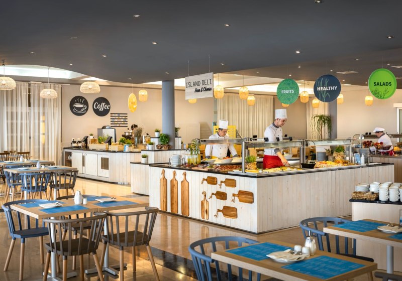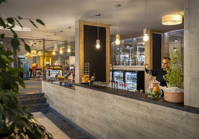 Im Hotelrestaurant mit Terrasse esst Ihr drinnen oder unter freiem Himmel. Die Küche deckt verschiedene Verpflegungen ab – von Frühstück über Halb- bis Vollpension sowie Optionen für Mittag- und Abendessen. Angeboten werden vegetarische und glutenfreie Speisen sowie Diätgerichte, dazu Live-Kochen und spezielle Angebote an ausgewählten Tagen.