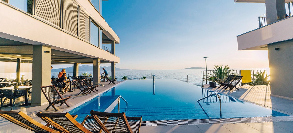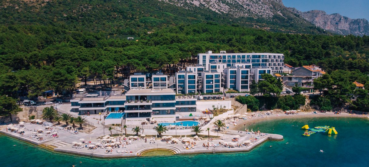 Im Morenia Beach Resort wohnt Ihr in erster Reihe zum Meer in Podaca, an der Makarska Riviera. Die Anlage wurde 2018 erbaut und wirkt klar strukturiert: ein Hauptgebäude mit zehn Nebengebäuden, kurze Wege, zwei Süßwasserpools und ein separates Kinderbecken. Das Ambiente ist entspannt, mit viel Platz für Familien und Paare.