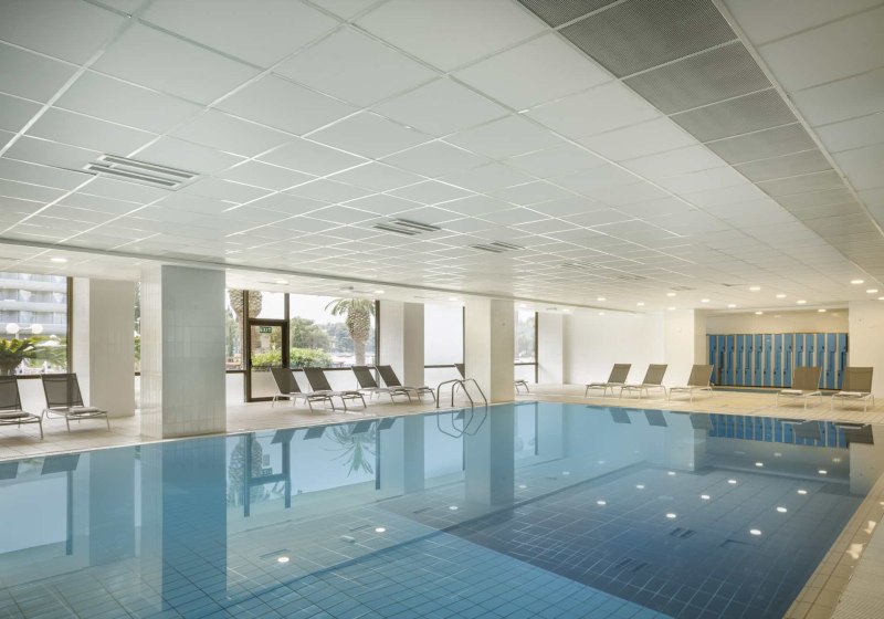 Rund um die Pools findet Ihr Liegestühle, Sonnenschirme und eine Poolbar. Innen- und Außenpool schaffen wetterunabhängige Bahnen. Shops, Friseur, Bibliothek, Konferenzraum sowie Spiel- und TV‑Zimmer erweitern das Angebot. Parkplatz und Ladestation für Elektrofahrzeuge erleichtern die Anreise, Mietwagen- und Fahrradverleih die Mobilität. Highlight: Innen- und Außenpool mit Sonnenterrassen und Servicepunkten.