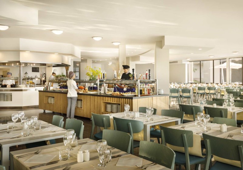 Im Hauptrestaurant esst Ihr flexibel: Von Frühstück bis Abendessen stehen vielfältige Verpflegungsarten bereit, darunter All‑Inclusive, Halbpension und einzelne Mahlzeiten. Live‑Kochen bringt Bewegung ans Buffet, Kindermenüs und vegetarische Optionen bieten praktische Auswahl. Diätgerichte und Snacks erweitern den Tagesablauf, ohne Wege zu verlängern.