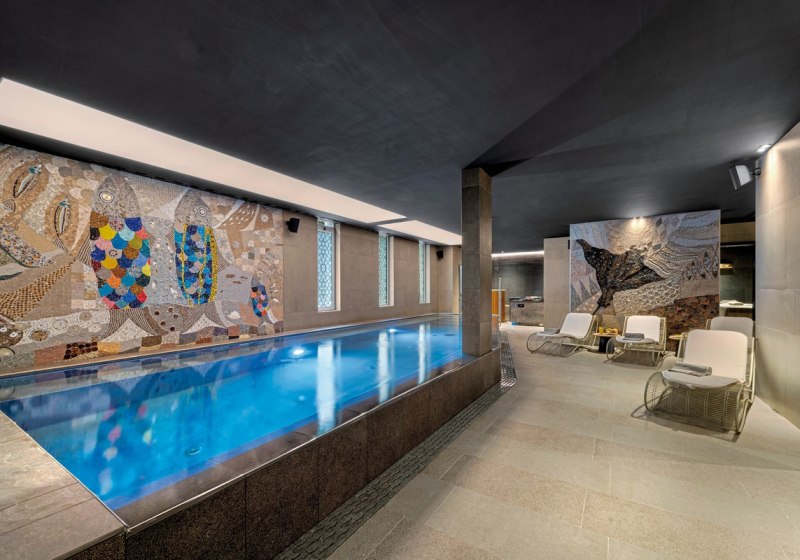 • Liegestühle • Hallenbad • Außenpool • Sonnenschirme • Poolbar • Sonnenterrasse • Pool