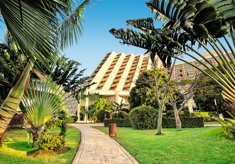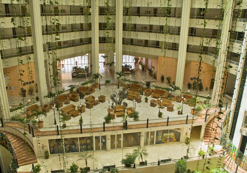 Die Architektur prägt den Eindruck: 13 Etagen in Pyramidenform mit offenem Atrium, dazu eine weitläufige Poollandschaft und eine große Sonnenterrasse. Der 35.000 m² Garten rahmt Wege und Rückzugsorte, bis Ihr über Dünenpfade den Strand erreicht. WLAN ist in der gesamten Anlage kostenlos nutzbar.