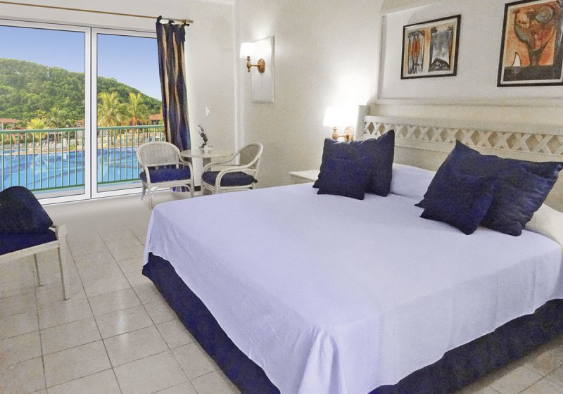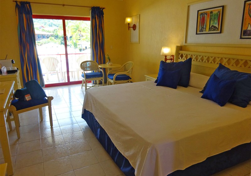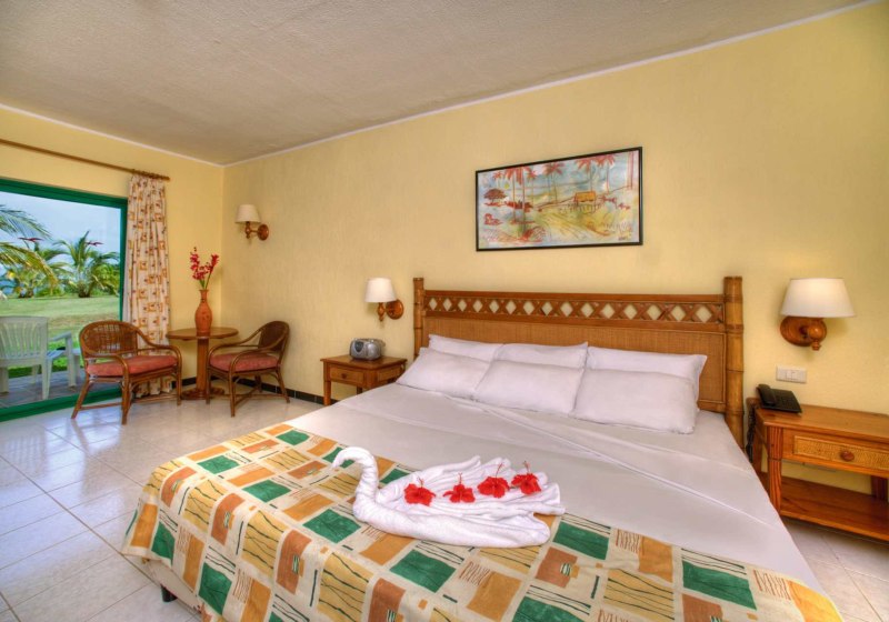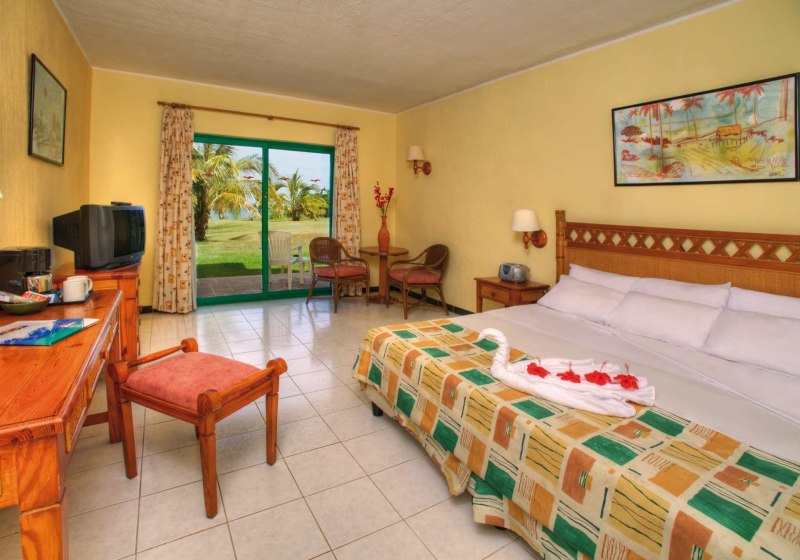 Die Zimmer sind funktional ausgestattet: Bad mit WC, Föhn und 220‑Volt‑Anschlüssen, zentral gesteuerte Klimaanlage, Sat‑TV, Telefon, Safe inklusive, Kaffee‑/Teezubereiter und Minikühlschrank. Balkon oder Terrasse öffnen den Blick in Garten oder Richtung Pool; Zimmer zur Poolseite sind buchbar.