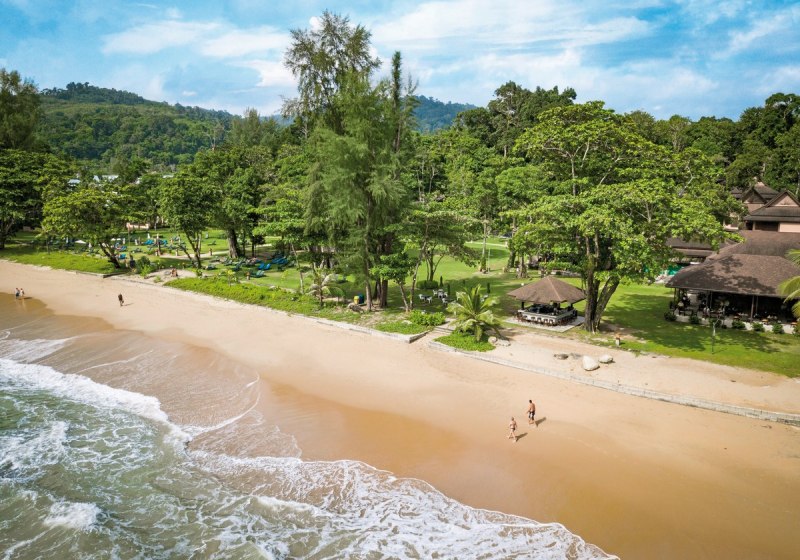 Die Lage kombiniert direkten Sandstrand von Khao Lak mit der natürlichen Kulisse am Anfang des Khao-Lak-Nationalparks. Durch die Hanglage erlebt Ihr Höhenstaffelungen und Treppen innerhalb der Anlage, dafür liegt das Meer buchstäblich vor der Tür. Das Zentrum von Khao Lak erreicht Ihr in etwa zehn Fahrminuten, der Transfer vom Flughafen Phuket beträgt rund sechzig Minuten. Rund um das Resort sind die Wege kurz: Restaurants und Bars liegen etwa 100 Meter entfernt, öffentlicher Nahverkehr circa 200 Meter. Wer Abwechslung sucht, hat den Wald in rund 1.000 Metern und einen Golfplatz in etwa 3.000 Metern Reichweite. Am Strand stehen Liegen und Sonnenschirme bereit, die Atmosphäre bleibt dank der ruhigen Lage angenehm gelassen. So fügt sich das Resort als Strandhotel mit naturnaher Note in eine Umgebung, die sowohl Auszeiten am Meer als auch Ausflüge ins Grüne ermöglicht.