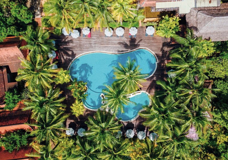 Die Atmosphäre wirkt entspannt und geordnet, ohne Betriebsamkeit. Am großen Salzwasser-Pool wählt Ihr Sonnenplätze oder Rückzug im Halbschatten. Das Bhandari Spa liegt nur wenige Schritte entfernt, sodass Ihr Anwendungen unkompliziert einplant. Highlight: Stilvolles Resort im Thai-Design, überschaubar und gut strukturiert.