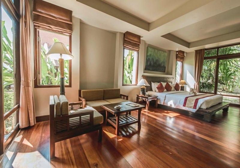 Die Zimmer und Bungalows sind großzügig geschnitten und praktisch ausgestattet – mit Balkon oder Terrasse als privatem Außenplatz. In einigen Bungalows setzt ein teilweise offenes Bad einen besonderen Akzent. Kaffee- und Teezubereiter, Safe sowie Klimaanlage gehören zur Basisausstattung, die Euren Alltag angenehm erleichtert.