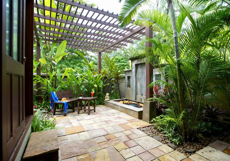 • Draußen genießen: Balkon oder Terrasse, teils Outdoor-Bad in den Bungalows.