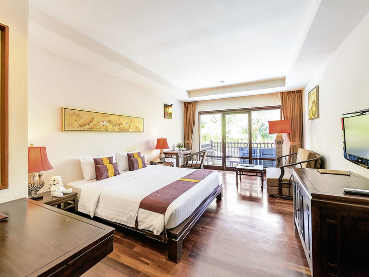 Die Zimmer bieten rund 32 m² Raum und öffnen sich zu Balkon oder Terrasse. Ihr findet eine klare, praktische Ausstattung: Dusche und WC, Föhn, Bademäntel und Badetücher, Klimaanlage, Telefon, Flachbild-TV, Safe sowie Kaffee- und Teezubereiter. Eine Sitzecke schafft einen ruhigen Platz für die nächste Lektüre oder die Planung des Abends in Khao Lak.