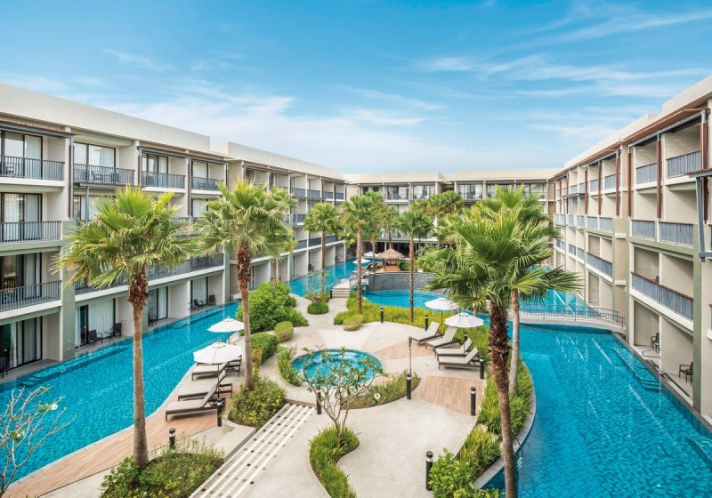 Im Le Meridien Khao Lak Resort & Spa wohnt Ihr in einer weitläufigen Anlage direkt am Bangsak Strand. Die Stimmung wirkt entspannt und aufgeräumt, mit Platz für Paare, Freundesgruppen und Familien. Drei große Pools und ein eigener Kinderpool strukturieren die Außenbereiche, während Loungelandschaften und Gärten die Wege zu Restaurants, Bars und dem Spa begleiten. Highlight: Direkte Strandlage mit drei Pools und klarer Struktur für erholsame Tage.
