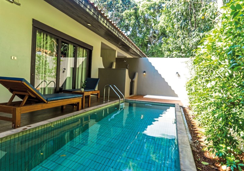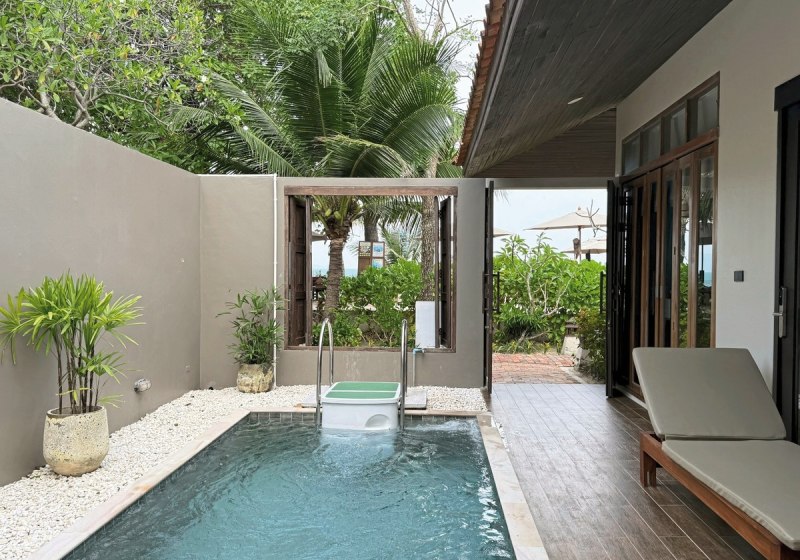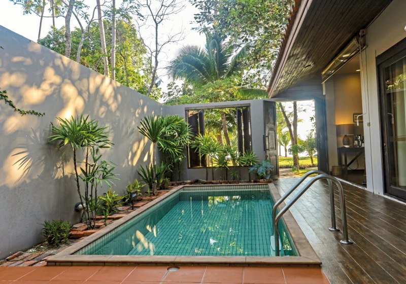 In Saree Samui wohnt Ihr in einer Anlage, die als thailändisches Dorf konzipiert ist. Holz, Grün und offene Wege prägen das Bild, dazwischen viel Ruhe und klare Strukturen. Die Villen verteilen sich in einer gepflegten Gartenanlage, wodurch Ihr Privatsphäre und kurze Wege zugleich erlebt. Direkt davor liegt der Maenam Beach, ein langer Strandabschnitt, der Euren Tagesrhythmus bestimmt: erst Meer, dann Pool, später zurück auf die eigene Terrasse.