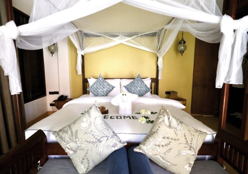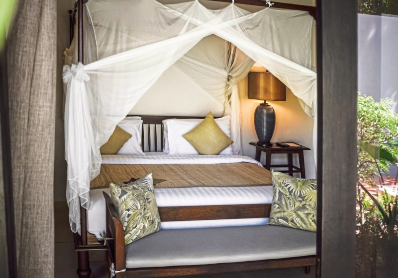 Ihr wohnt in großzügigen Villen mit etwa 91 bis 100 Quadratmetern. Ein separates Schlafzimmer schafft Ordnung, die Terrasse öffnet sich in den Garten. Innen sorgen Klimaanlage und Ventilator für das richtige Klima; Safe, kostenpflichtige Minibar, TV mit deutschsprachigen Programmen, DVD-Player sowie Kaffee- und Teezubereiter strukturieren Euren Alltag zwischen Strandgängen und Ruhezeiten.