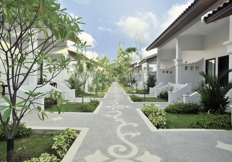 Im Duangjitt Resort & Spa wohnt Ihr in einer weitläufigen Anlage mit 2- bis 3‑stöckigen Gebäuden und Bungalows, eingebettet in eine rund 36 Hektar grosse Gartenlandschaft. Drei Poolbereiche mit lagunenartiger Formgebung strukturieren die Wege, während die offene Lobby-Rezeption sofort ein luftiges, entspanntes Gefühl vermittelt. Highlight: Grüne Weite und Wasserwege prägen den Aufenthalt spürbar.