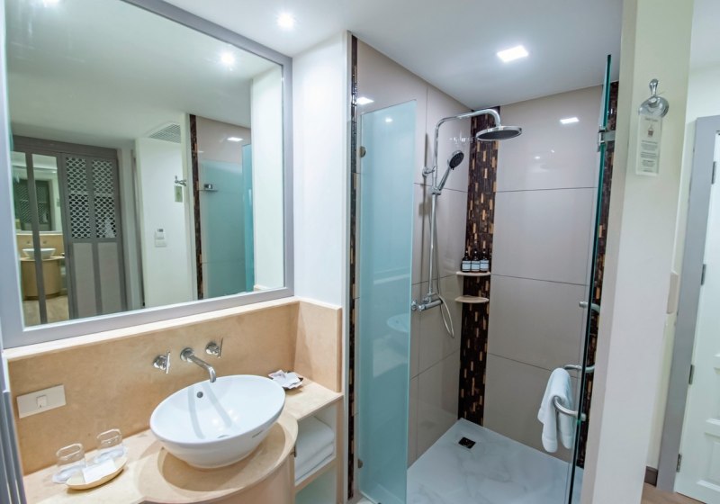 Die Infrastruktur ist umfangreich: 498 Zimmer verteilen sich auf niedrige Gebäude und Bungalows mit je vier Einheiten. Offene Lobby, mehrere Poolbereiche, Sonnenterrassen sowie Liegen und Schirme am Pool strukturieren die Wege. WLAN im gesamten Resort hält Euch stets verbunden. Highlight: Drei Poolbereiche mit lagunenartiger Gestaltung schaffen klare Orientierungen.