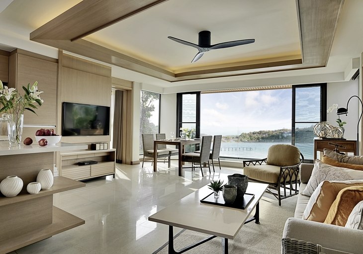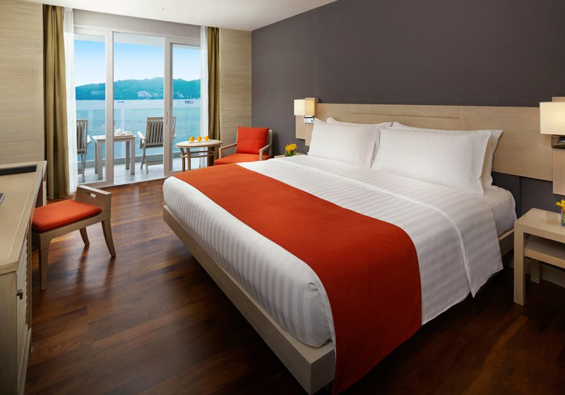 Ihr wohnt in Zimmern mit Balkon, Klimaanlage und Safe; dazu Sat-TV, DVD-Player, Kaffee- und Teezubereiter sowie Minibar gegen Gebühr. Badezimmer mit Dusche und Föhn sind standardisiert. Verfügbare Zimmer mit Meerblick öffnen den Blick auf die Bucht, Größen bewegen sich etwa zwischen 33 und 43 Quadratmetern.