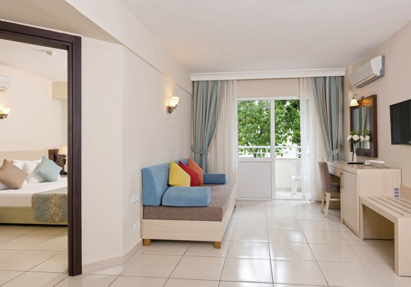 Die Anlage ist weitläufig und funktional: Lobby mit Rezeption, TV-Raum und durchgängiges WLAN. Ein Poolensemble mit zwei Außenpools, Kinderbecken und Wasserrutschen bildet den Mittelpunkt. Sonnenschirme, Liegen und Badetuchservice sind am Pool und am Strand vorgesehen.