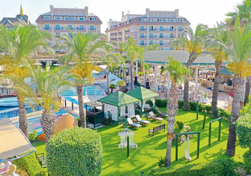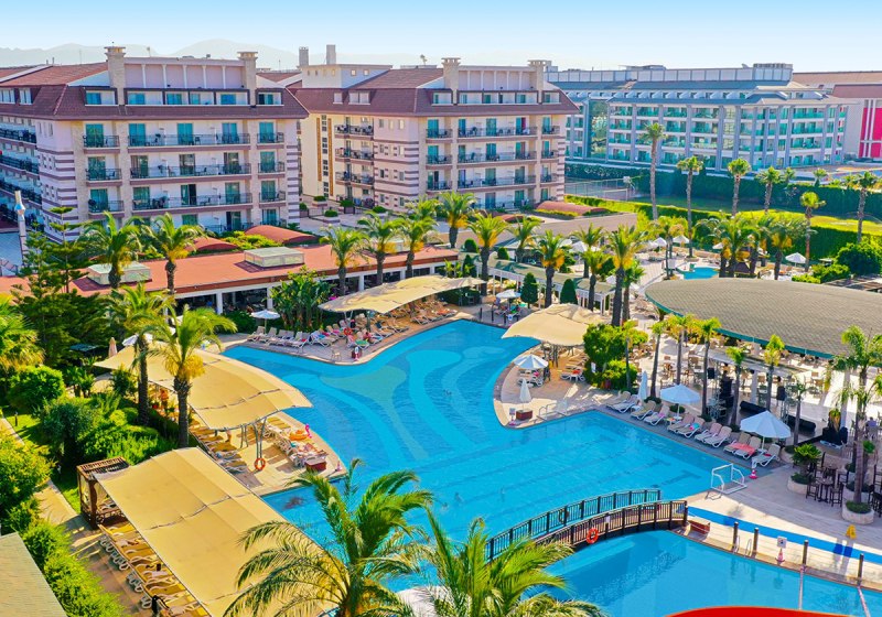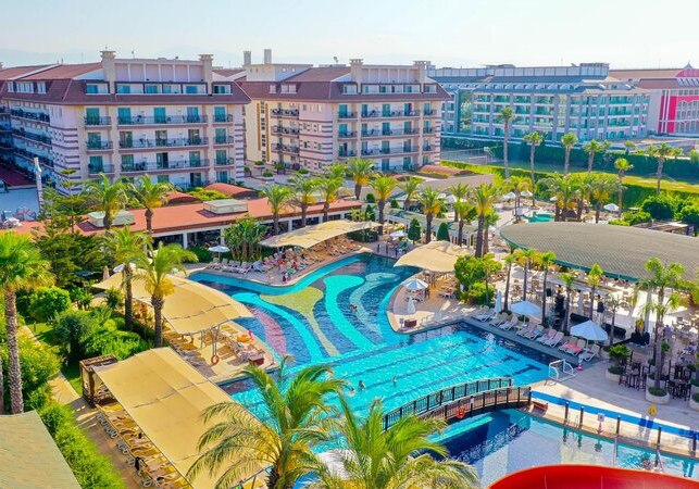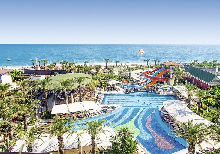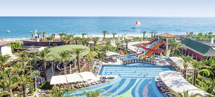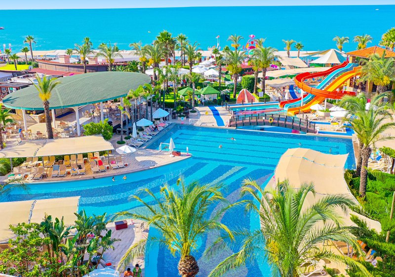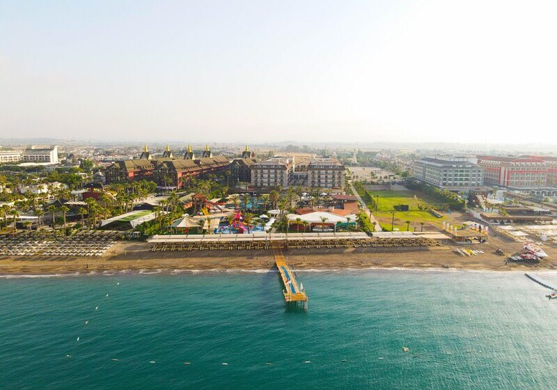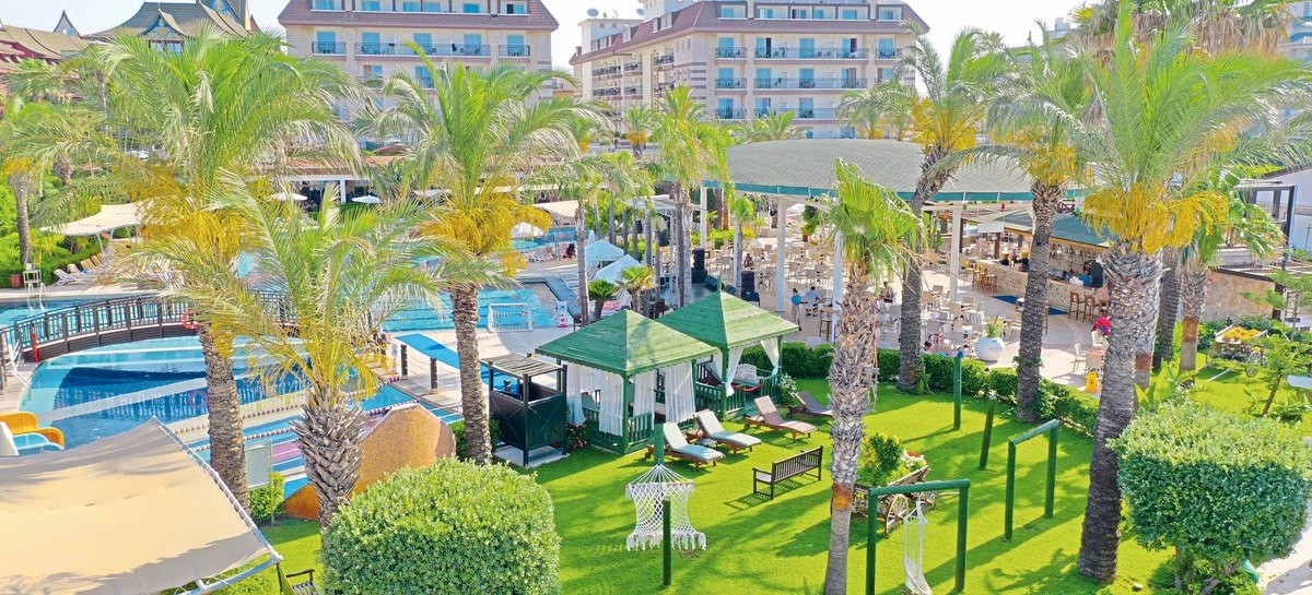 Im Crystal Family Comfort Collection erlebt Ihr eine weitläufige Anlage mit klarer Struktur: vier Gebäude mit fünf Etagen, verbunden durch eine grüne Gartenanlage. Der Blick führt Euch von der Lobby-Lounge zu drei Süßwasser-Außenpools und dem Aquapark. Direkt davor wartet der hoteleigene Kies‑/Sandstrand – 150 Meter lang und 100 Meter breit. Highlight: Direkter Strandzugang mit großem Poolbereich und Aquapark.