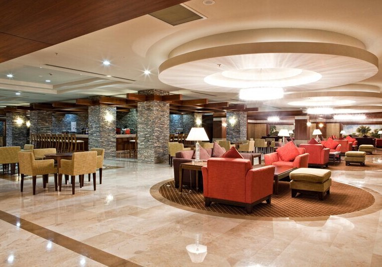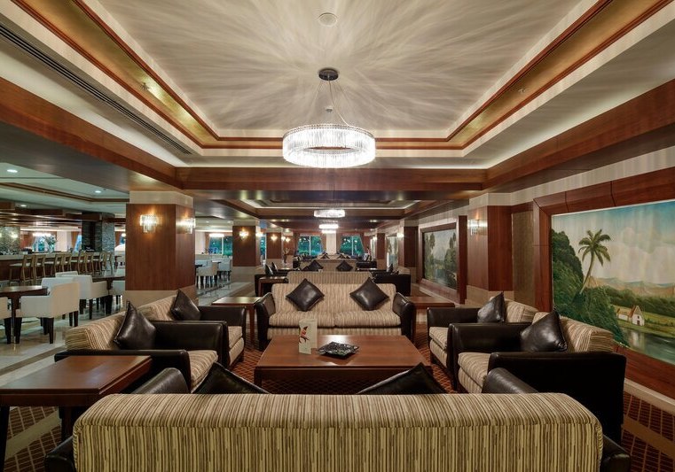 Die Anlage ist groß, aber übersichtlich: Empfangshalle mit Rezeption, Lobby‑Lounge, Lifts in vier Gebäuden und ein klarer Weg zu Garten, Pools und Strand. WLAN ist in allen Bereichen und Zimmern inklusive. Ein kleines Einkaufszentrum, Friseur und Café runden die öffentlichen Bereiche ab. Highlight: Kostenfreies WLAN durchgängig nutzbar.