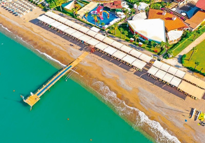 Ihr wohnt in Bogazkent direkt am hoteleigenen Kies‑/Sandstrand; die Breite von 100 Metern und die Länge von 150 Metern schaffen Übersicht und kurze Wege. Bis Bogazkent sind es rund 1 Kilometer; Minibusse und Taxis halten vor dem Hotel. So kombiniert Ihr Strandnähe mit schneller Anbindung an Läden und Restaurants. Highlight: Kurzer Weg ins Zentrum und unmittelbarer Strandzugang.