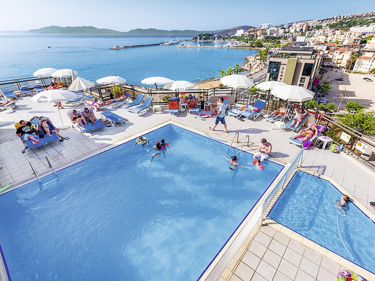 Im Derici erlebt Ihr ein zentrales Strandhotel in Kusadasi, das Euch kurze Wege und klare Strukturen bietet. Haupt- und Nebengebäude bilden eine kompakte Einheit mit 24‑h‑Rezeption, WLAN im gesamten Haus und Sonnenterrasse am Pool. Für Strandtage erreicht Ihr den öffentlichen Sand‑/Kiesabschnitt nach wenigen Schritten. Highlight: Kurzer Weg zum Strand und in die Stadt für flexible Tage.